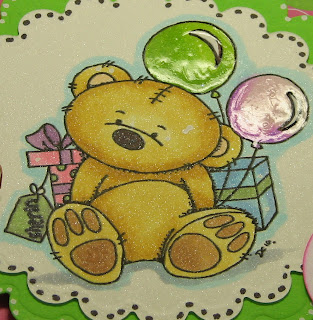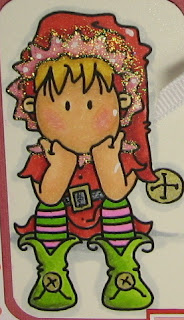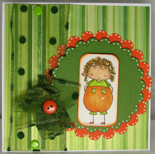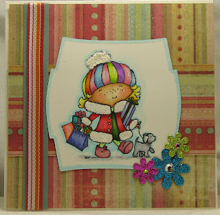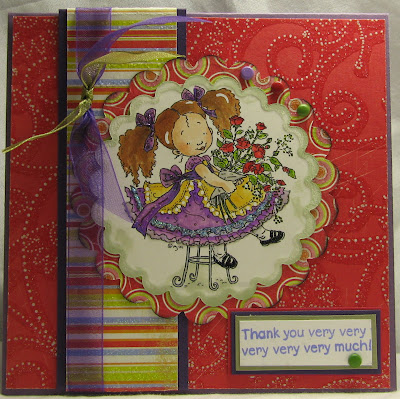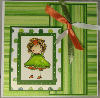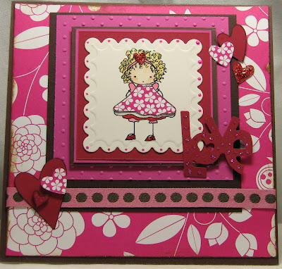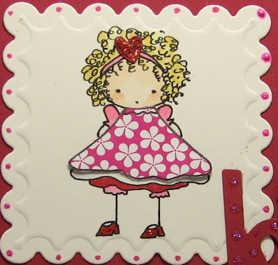 ~Digital image by Baby Bud Designs colored with Copics, dress printed on and cut from PaperTrey Ink Raspberry Fizz Mix design paper, shoes topped with Stickles Candy Cane, die cut heart also topped with Stickles Candy Cane, scalloped square cut using Spellbinders and Cuttlebug, dots created with Smooch Sassy Pink