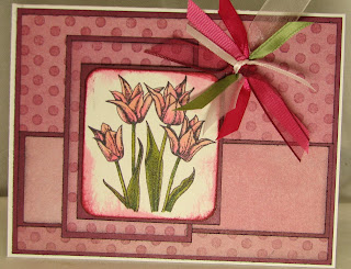 ~Layer of brown cardstock topped with PaperTrey Ink Raspberry Fizz dry embossed with Cuttlebug Swiss Dots embossing folder, layer of brown, pink, red cardstocks to frame image
