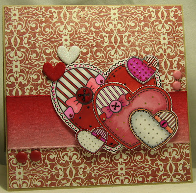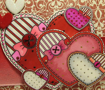 ~Digital image Torico's Digital Gallery (freebie) printed a large, medium and two small hearts, paper cut the smallest hearts, colored with Copics, and fine point Sharpies, dotted with Stickles: Diamond, Cotton Candy, Black Diamond, Fruit Punch, Diamonds, printed buttons highlighted with Stampin' Up Crystal Effects; dots of Smooch - Sassy Pink and Gold Lame