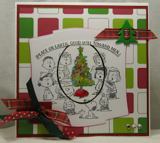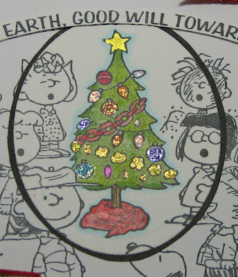 ~Image is Stampabilities stamp Peanuts Gang Caroling (a transfer of treasure for daughter Amy) using Memento's Tuxedo Black, colored using the Spotlighting Technique and Copics, highlighted with Stickles, ovals of black and white cardstock cut using Spellbinders oval die