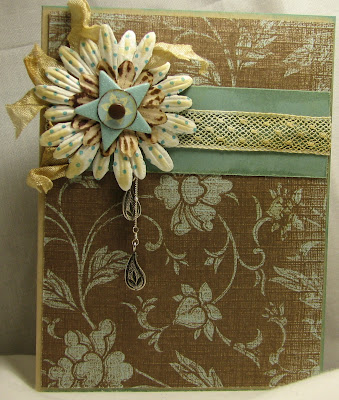 ~Corner 'clump': pieces of 'vintage' seam binding, Prima polka dot flower smudged slightly with Hero Arts Shadow Ink Soft Sand, beige Prima flower smudged with Tim Holtz Distress Ink Vintage, chipboard star, K & Company die cut pre-printed circle, metal brown brad, repurposed necklace