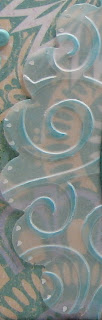 ~Spellbinders scallop circle die cut of vellum - edges dotted with Sharpie white poster paint and dry embossed using Cuttlebug Divine Swirl - embossed swirls highlighted the swirls using Color Box Fluid Chalk Blue Lagoon