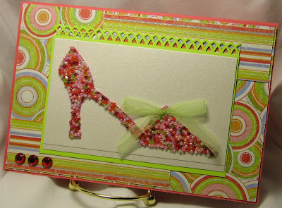 Yeah! Time in the bubble. I decided to get busy and work ahead on the request I know will be coming from Jennifer for blingy cards to give as gifts at Christmas. She loves all things bling so I 'kicked' off her yet to come request for cards with this strappy, sassy, party-ready shoe.