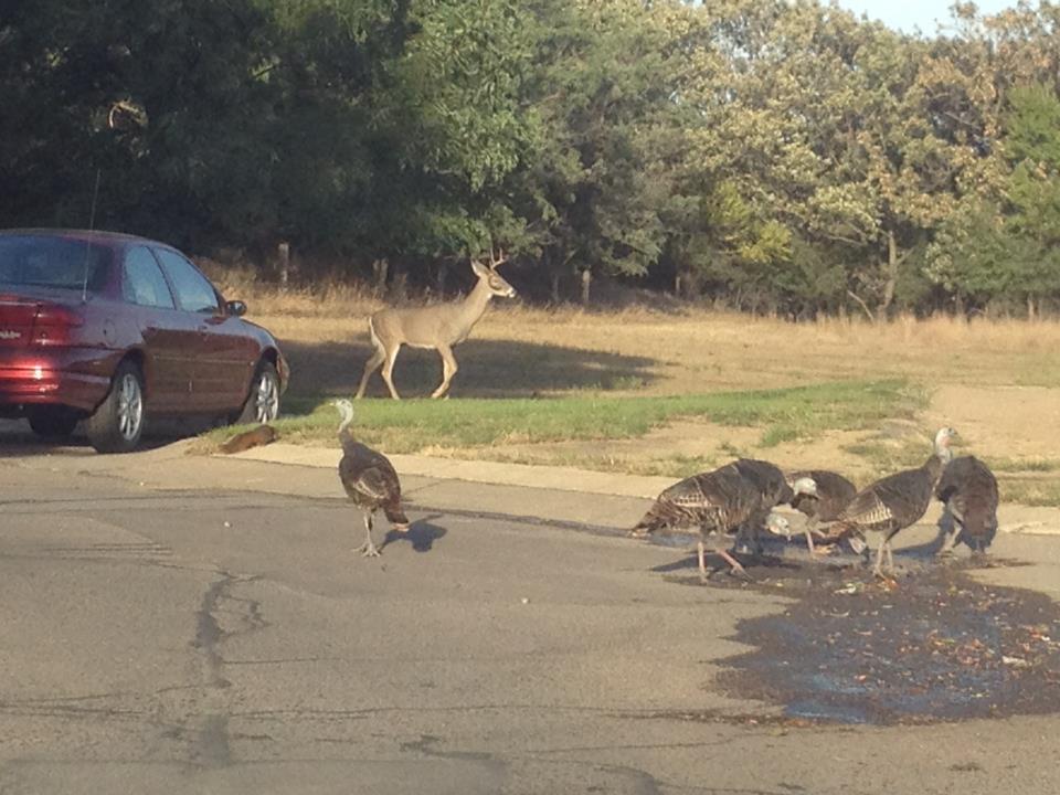 A friend of mine captured this photo walking to her car....ahhh...the view from the parking lot at work. Deer, wild turkeys, and a squirrel to complete the vignette! The university is perched on a hill, smack-dab in the middle of a residential area. It is 'crawlin' with animal (and student) wildlife!