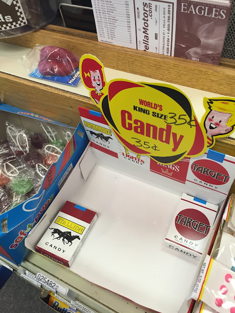 I am stunned that you can still buy candy cigarettes! REALLY!? And they are 35 cents! THIRTY FIVE CENTS!?!? Where AM I? Did I drive into a time warp?