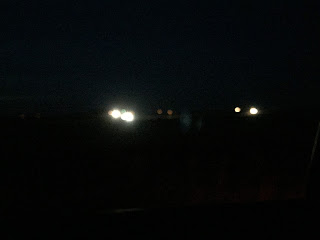 But I'm a farm kid at heart so I knew better. Those lights off in the distance - but getting persistently closer are farmers on combines. Its harvest time and a "little darkness" is not about to stop these high tech agronomists! They have crops to bring in! I couldn't help but stop the car and try for a few photos using my cell phone. They look even MORE like Little Green Men Martian Mobiles in the photos than they did in real life.