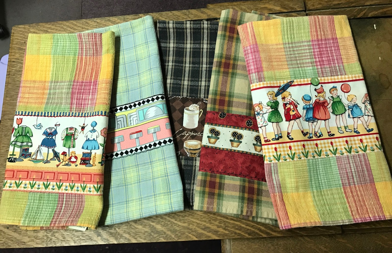 It must be a day for distractions. One look to my left and I spied my sewing machine. I decided I needed to sew! So....I embellished a few kitchen towels to have on hand for gifts. I'm embarrassed to say I actually had to dust off my sewing machine before I got started! Poor neglected Pfaff!